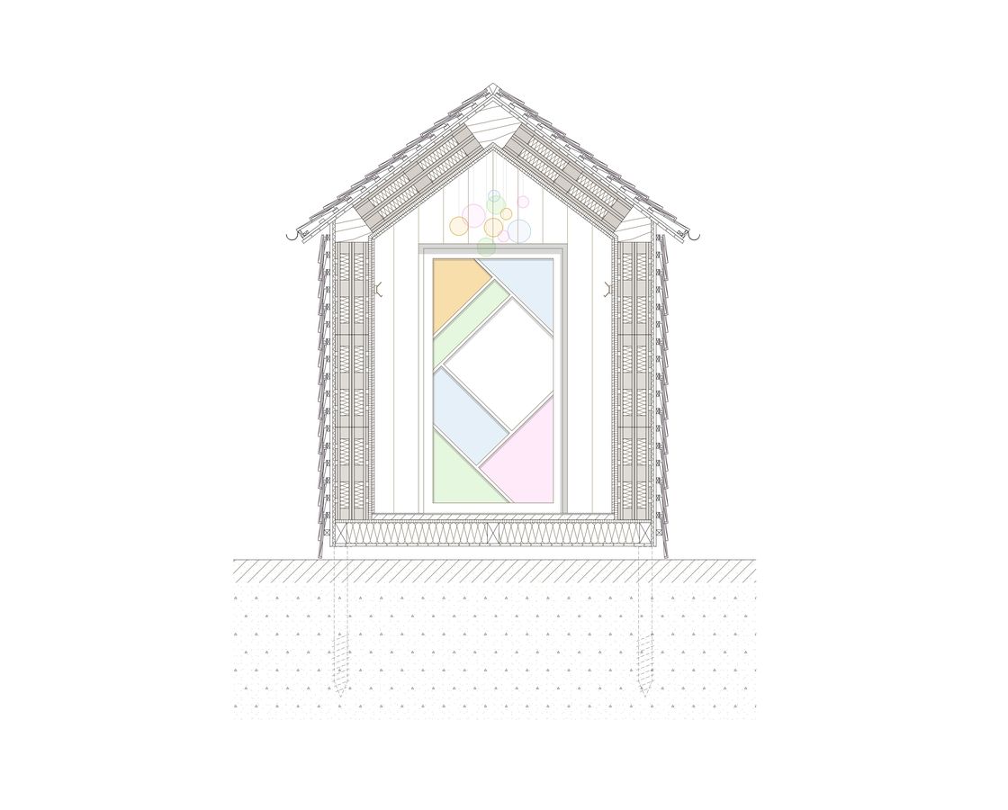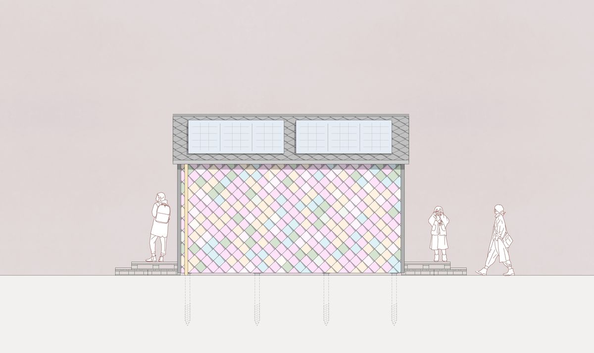 Farbige Glasflächen prägen den Innenraum und erzeugen durch einfallendes Tageslicht eine warme, lebendige Atmosphäre. Von außen wird der Pavillon als heller, farbiger Ort wahrgenommen, der sich bewusst vom umgebenden Stadtraum absetzt.