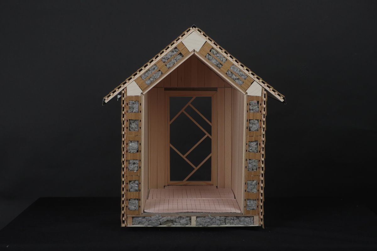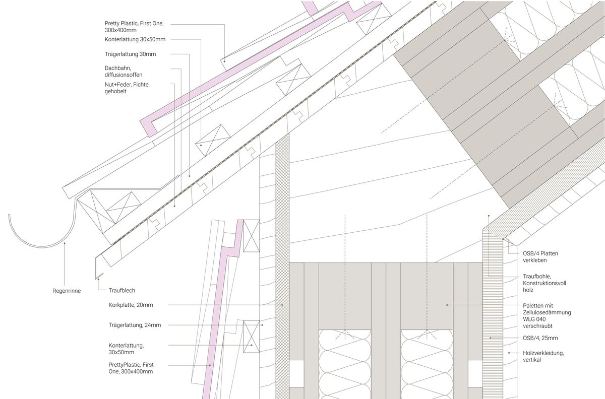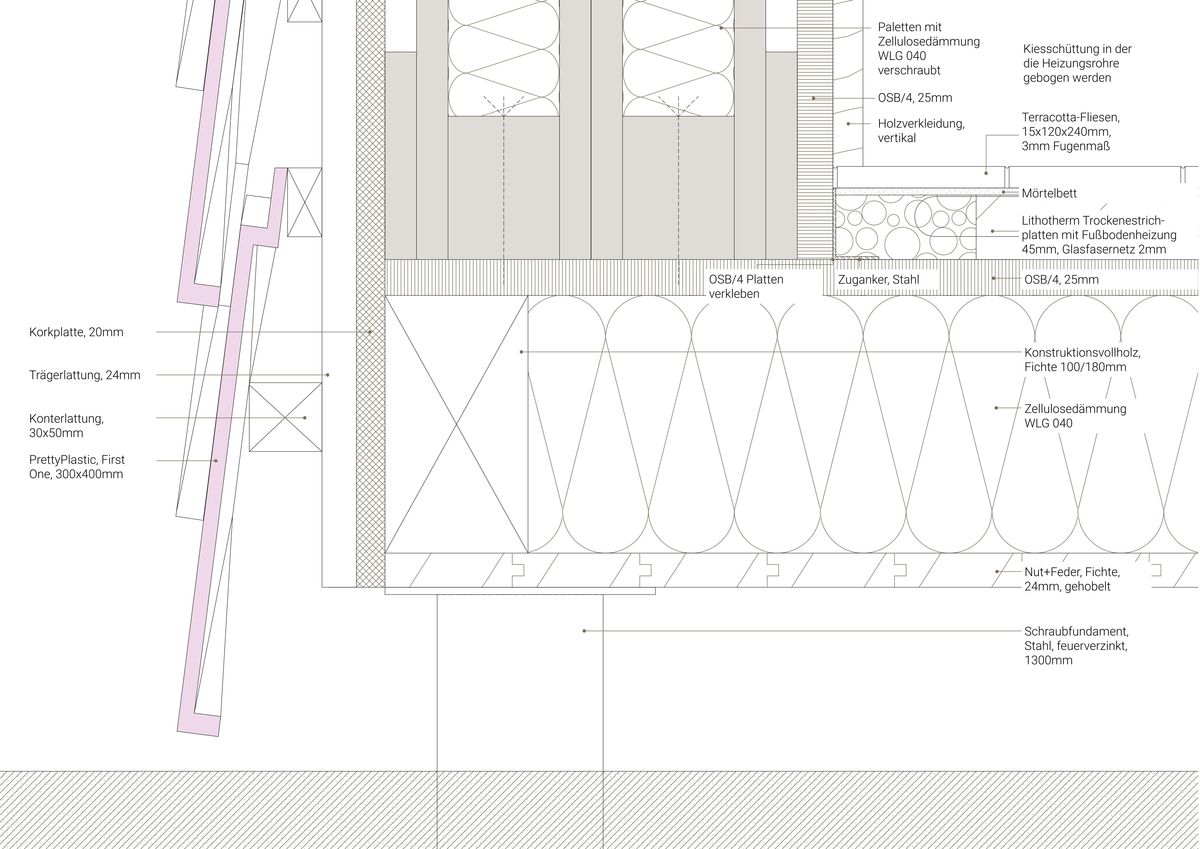 Die Konstruktion basiert auf gefügten Europaletten und Zellulosedämmung. Aufbau und